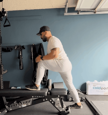 Start by setting up a bench on an incline (a higher incline will make this stretch easier). Place one shin on the bench to create an elevated pigeon stretch. Keep your chest tall and square your hips as best you can. Reach the opposite arm of the leg on the bench diagonally and down. leg your hips sink gently as you exhale slowly. This can be a very intense stretch so start off slow and play with the angle of the bench until you find what works for you.
