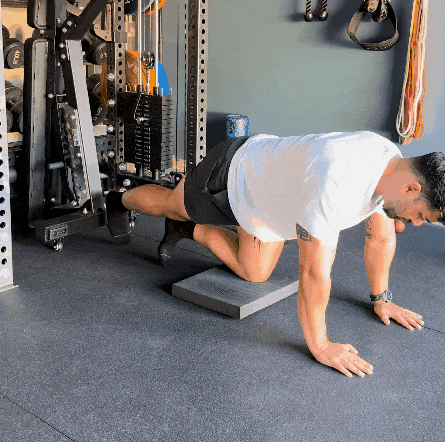 Start on all fours and extend one leg back. Use your glute to lift one leg up and slowly rotate as far out to your side as you can. Slowly rock your hips back while keeping your core engaged.